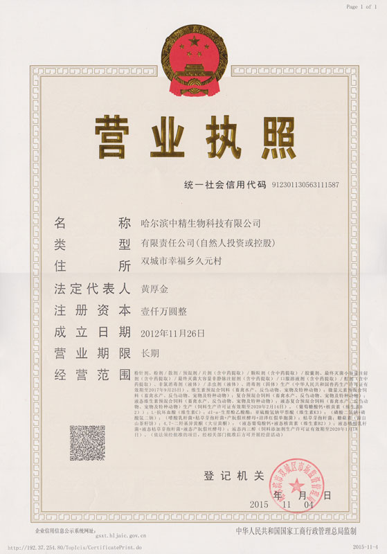 目前的哈爾濱中精生物科技有限公司已經發展成集獸藥研發、生產、銷售、推廣、服務為一體的大型科技公司。企業現有職工58人,技術人員13人占,其中,制藥相關專業的工程師1人,工程師1人,中級專業技術人員10人。公司注冊資本金額1000萬人民幣。公司占地面積2萬平方米,建筑面積8600平方米。公司總投資1.2億元,建有通過獸藥GMP驗收的14條獸藥生產線和4條飼料及添加劑生產線,可以同時生產獸藥及飼料兩大類產品,產品品種數量多達400多種。